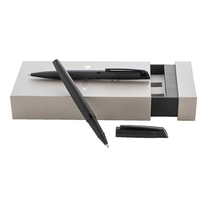 Elegantná sada kovového guľôčkového pera a roller pera v čiernej matnej úprave. V špeciálnej papierovej darčekovej krabičke a s modrou náplňou. Značkový produkt André Philippe.