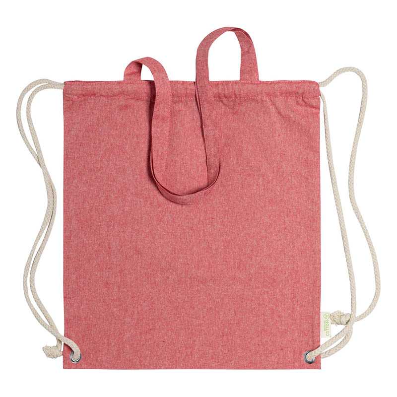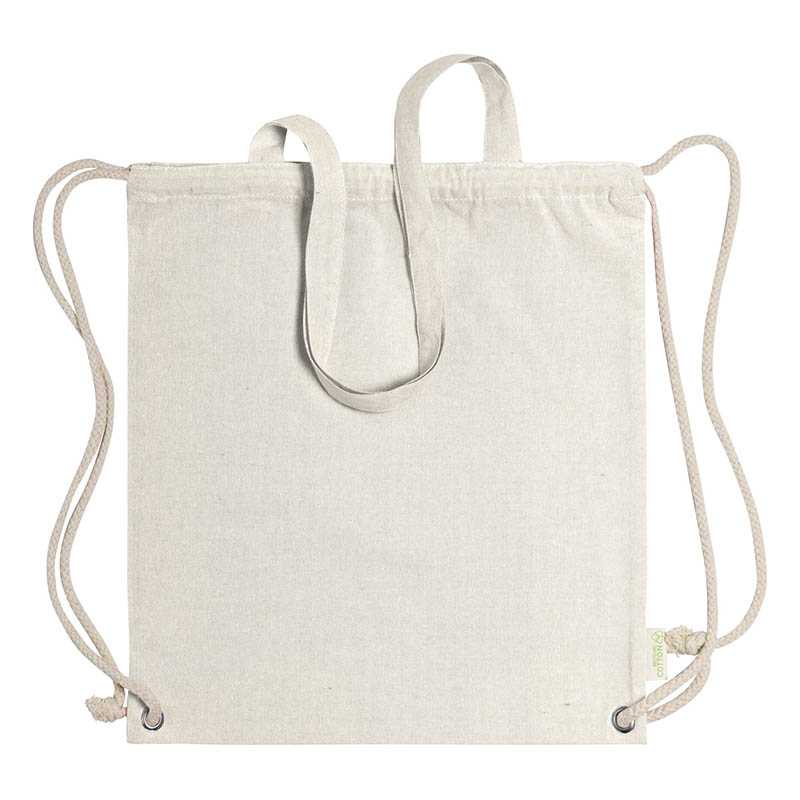 Vak z recyklovanej bavlny na sťahovanie silnými pletenými šnúrami, s dlhými uškami. Dá sa tiež použiť ako nákupná taška. 100% recyklovaná bavlna, 140 g/m2.