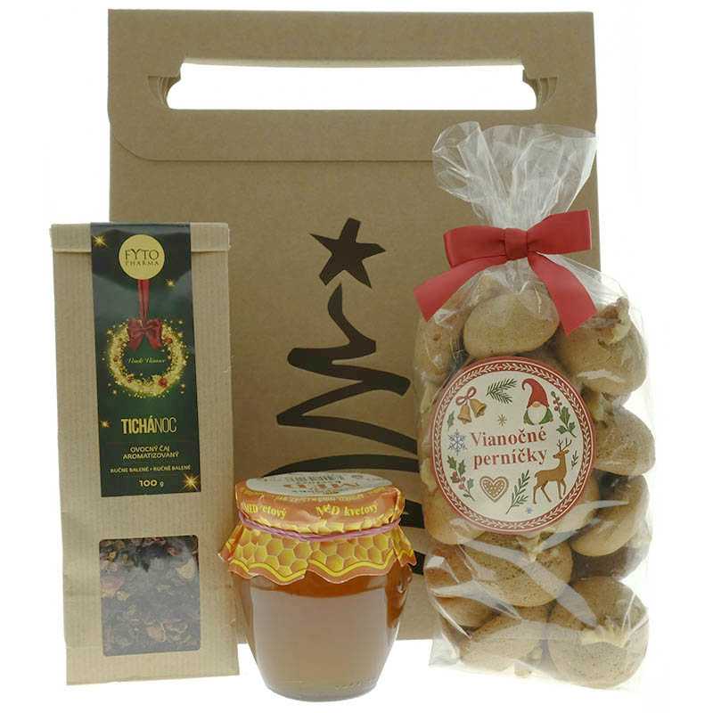 Vianočné perníky 250g, Kvetový med 250g amfora, Tichá noc 100 g sypaná ovocná zmes. Darčeková taška 30x23x10 cm