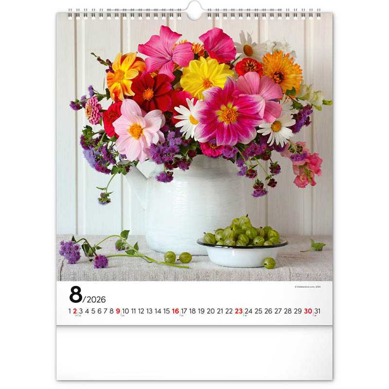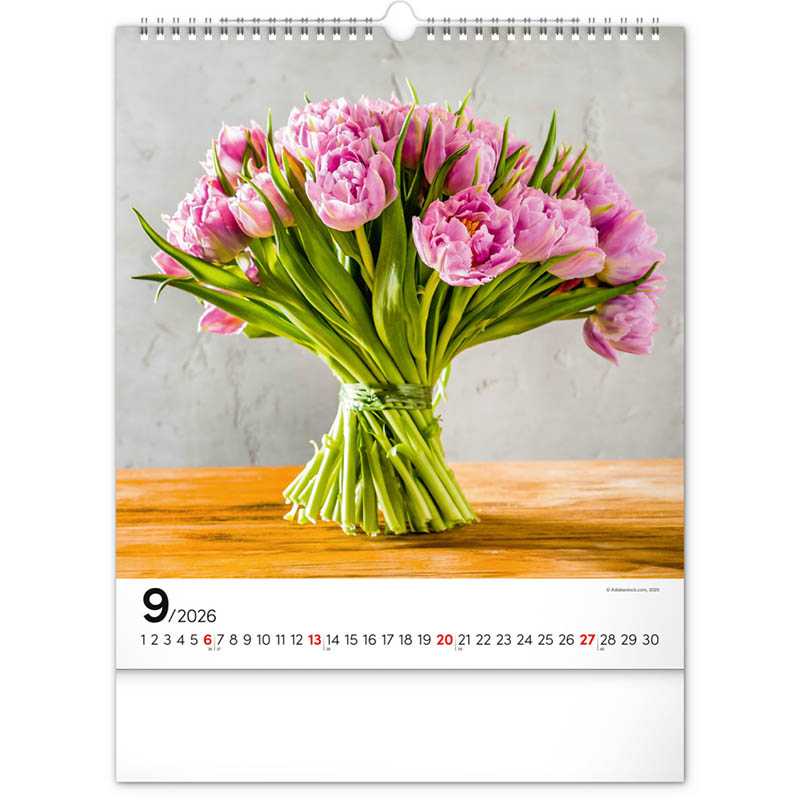 Dekoratívny kalendár vo výškovom formáte obsahuje slovenské kalendárium, mená a sviatky či pamätné dni a trojmesačný prehľad pri každom mesiaci. Kalendár dopĺňajú fotografie pestrofarebných a krásně naaranžovaných kvetín. Potešte fotografiami kvetinových aranžmá, ktoré na rozdiel od živých kvetov nikdy neopadnú a nespôsobia alergie.Priestor na potlač: 33 x 6 cm. Rozsah: 14 listov. Rozmer: 33 x 46 x 1 cm. Hmotnosť: 0,6. Papier: 150 g/m2. Väzba: dvojitá špirála. Kalendárium: slovenské.