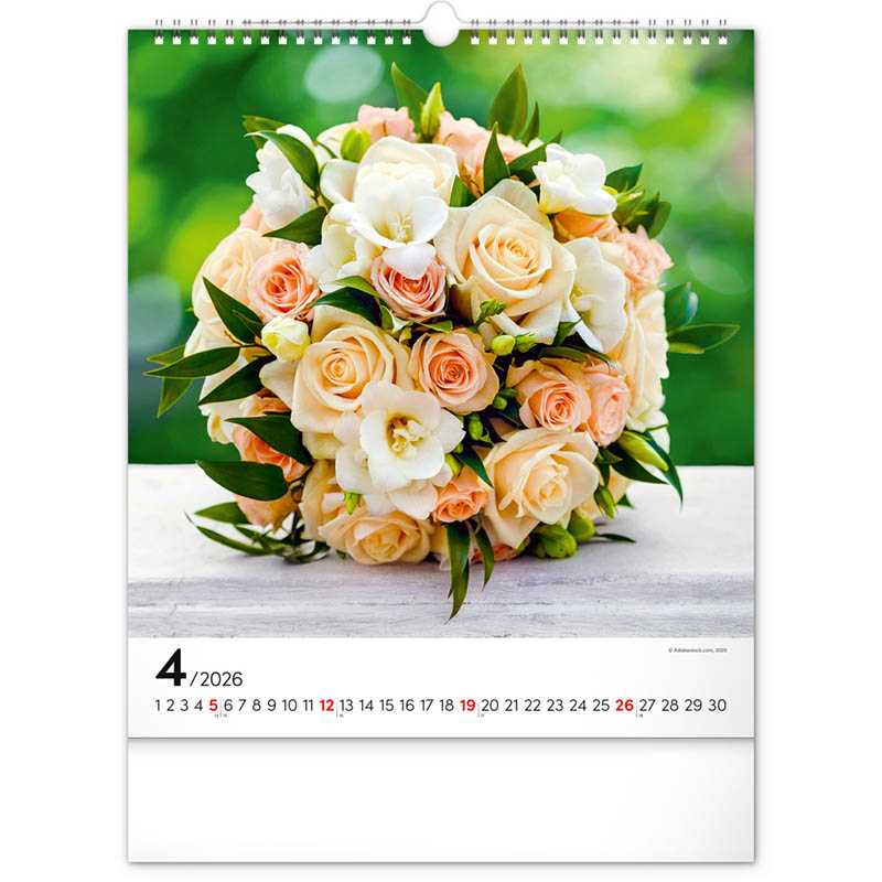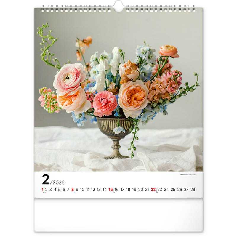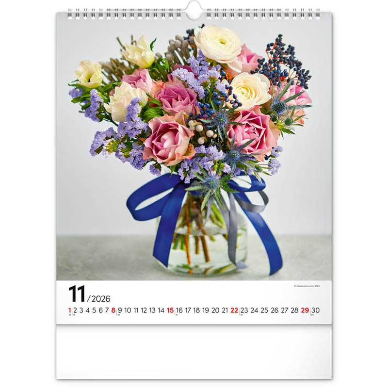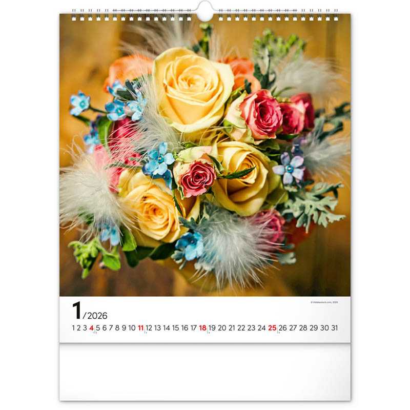 Fotografie pestrofarebných kvetov a originálnych väzieb v nástennom kalendári na výšku. Fotografie dopĺňa univerzálne kalendárium na bielom pozadí.Priestor na potlač: 30 x 6 cm. Rozsah: 14 listov. Rozmer: 30 x 34 x 1 cm. Hmotnosť: 0,25. Papier: 135 g/m2. Väzba: dvojitá špirála. Kalendárium: neutrálne.