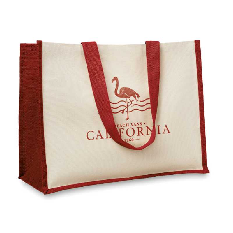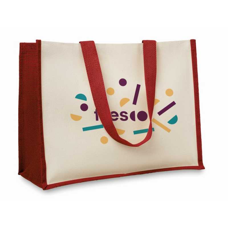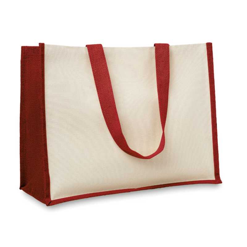 Nákupní taška z juty, z přední strany plátno a bavlněná tkanina. Dlouhá ucha.