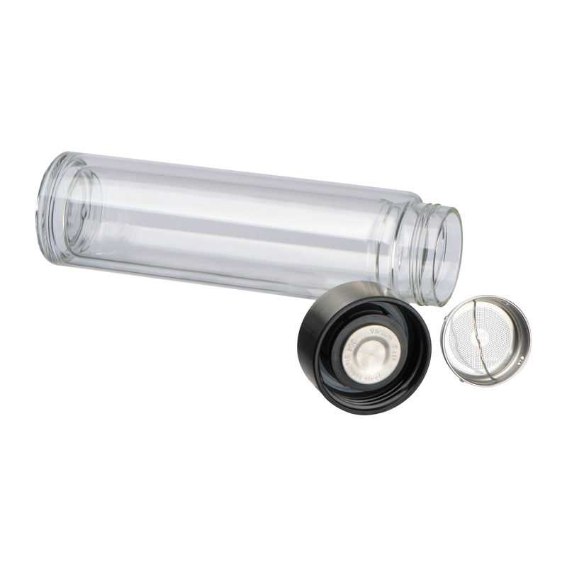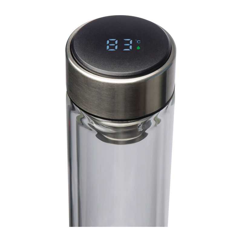 Termoska z borosilikátového skla s digitálnym ukazovateľom teploty vo veku, sitkom a objemom 400 ml.