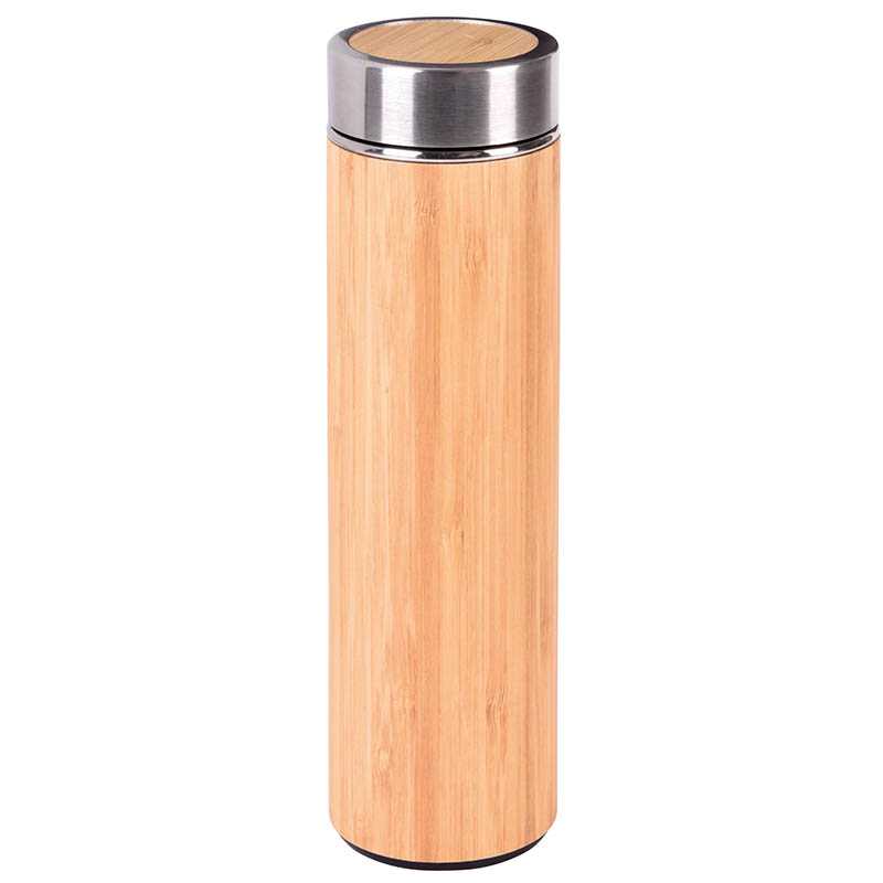 Insulated travel mug BAMBOO GO, double-walled: inside and outside made of stainless steel, outside covered in bamboo, secure screw-on lid with silicone sealing ring, with detachable strainer, capacity approx. 300 ml
