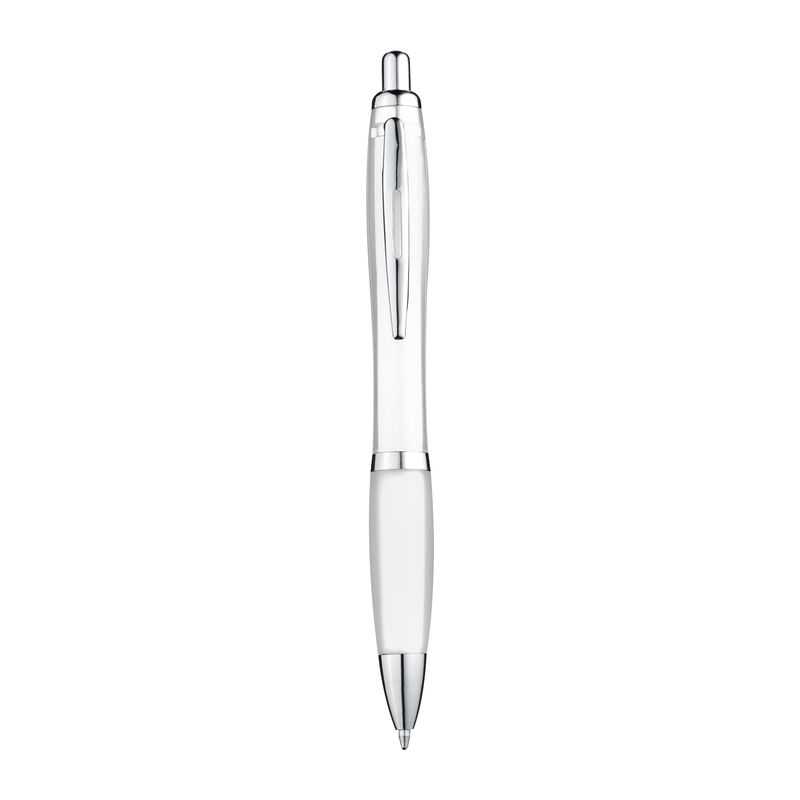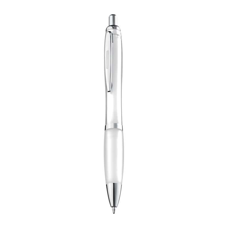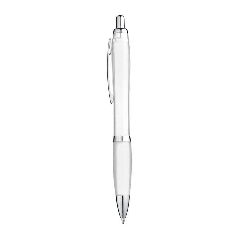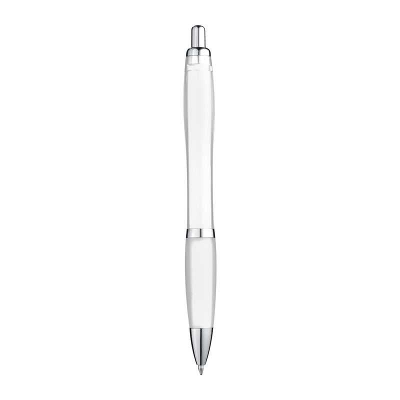Plastové guľôčkové pero s modrou náplňou a mäkkou vrúbkovanou gumenou úchytkou.