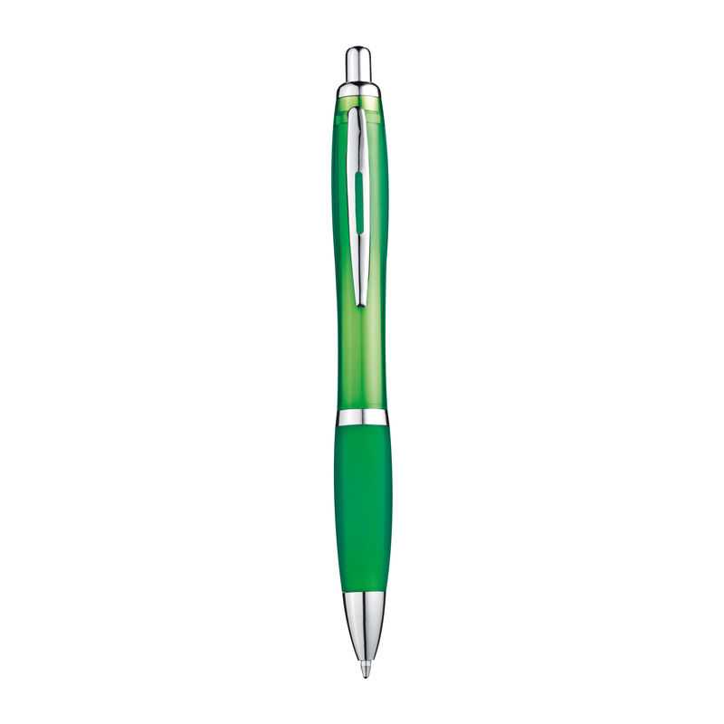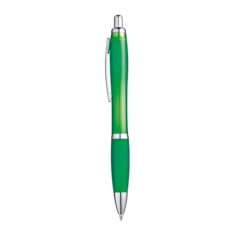 Plastové guľôčkové pero s modrou náplňou a mäkkou vrúbkovanou gumenou úchytkou.