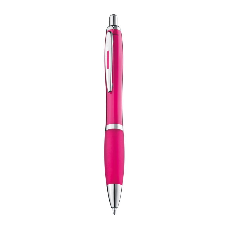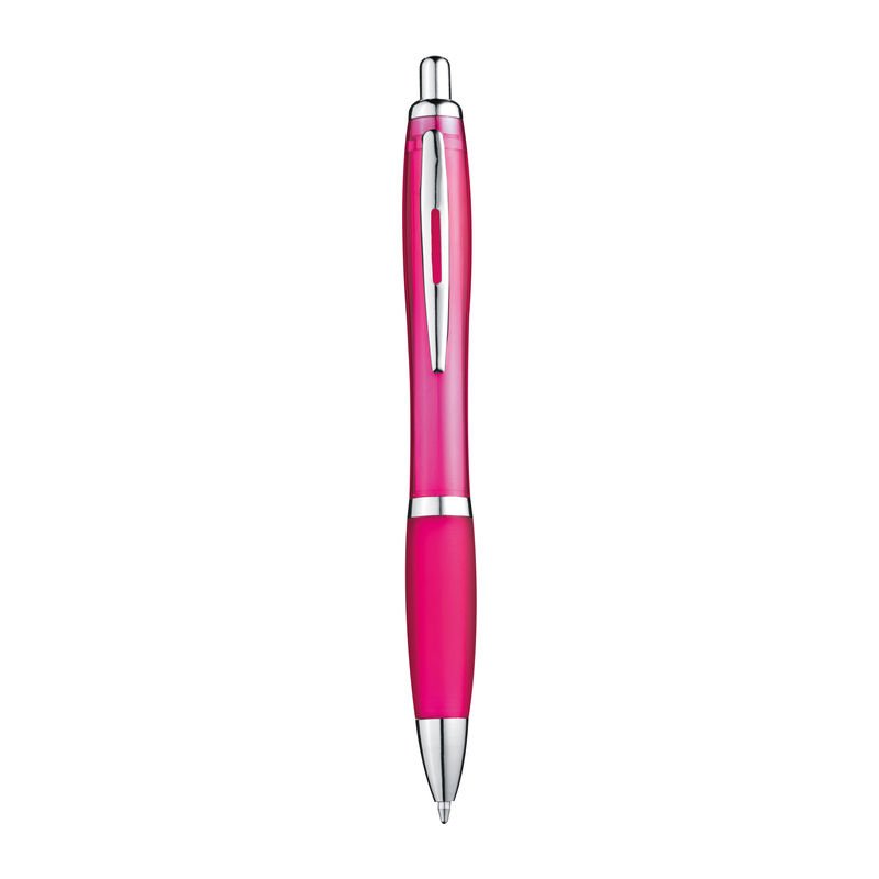 Plastové guľôčkové pero s modrou náplňou a mäkkou vrúbkovanou gumenou úchytkou.