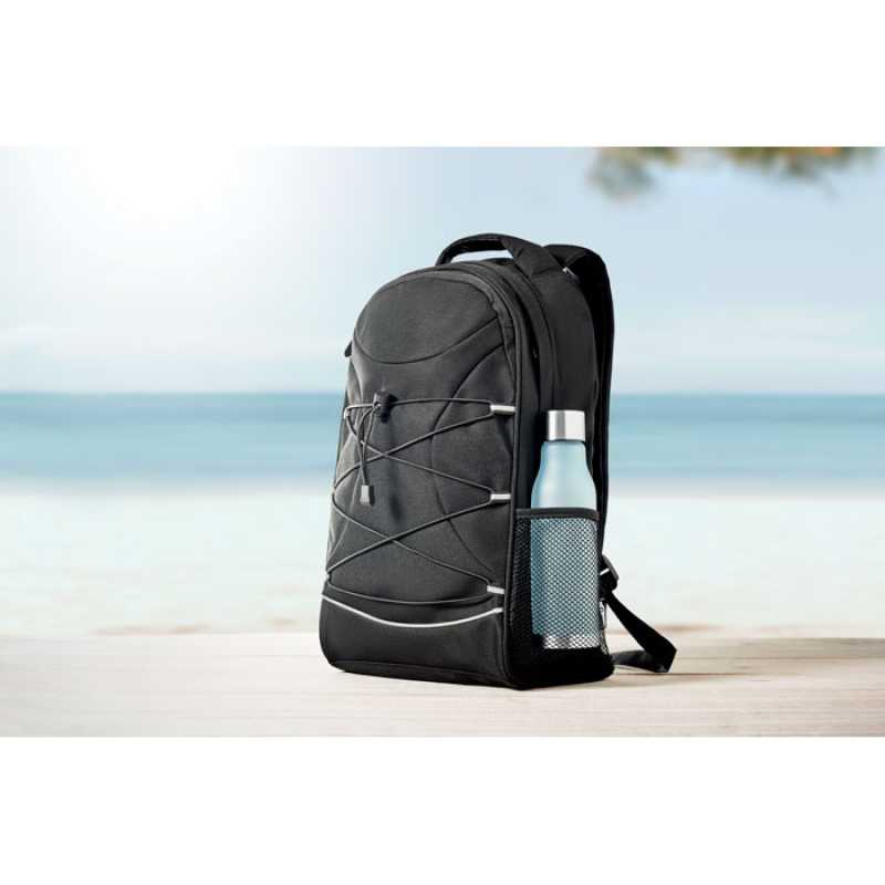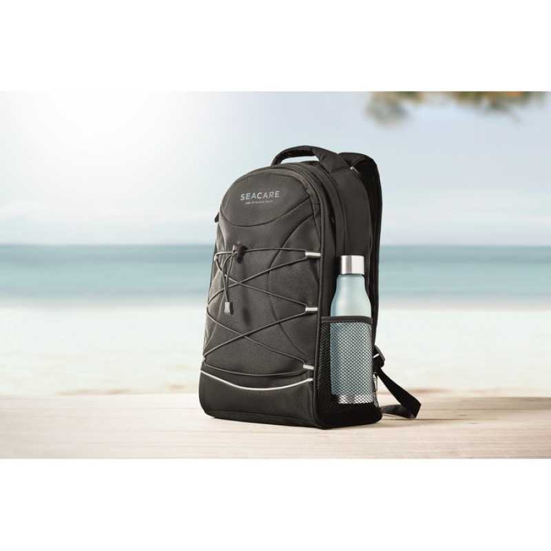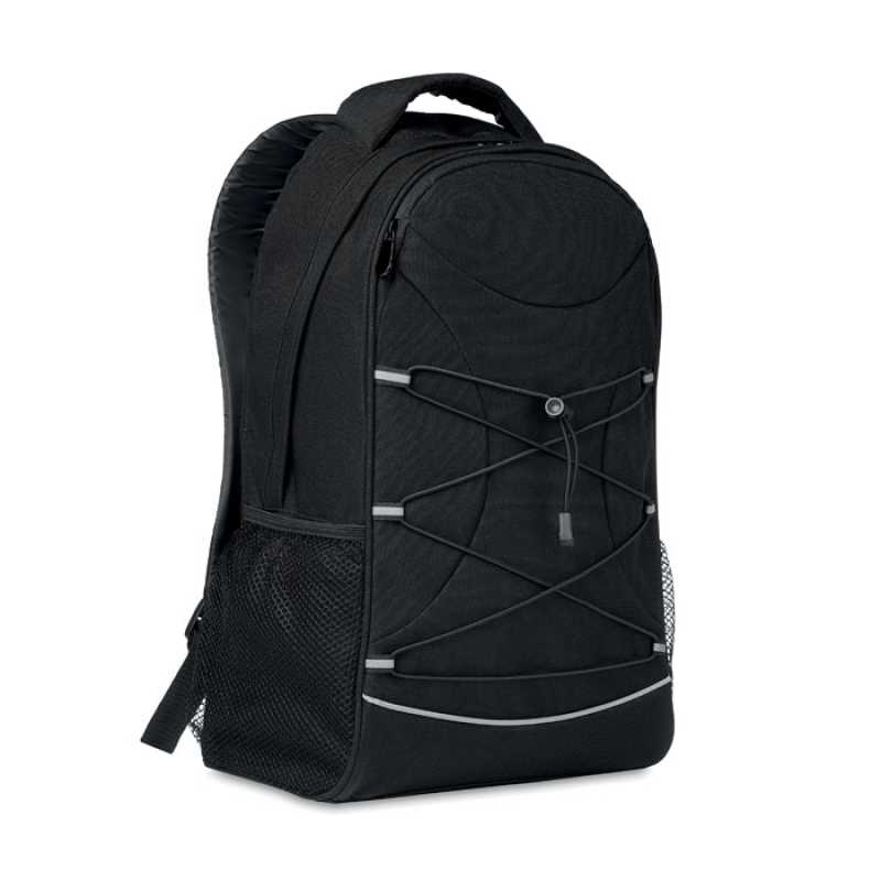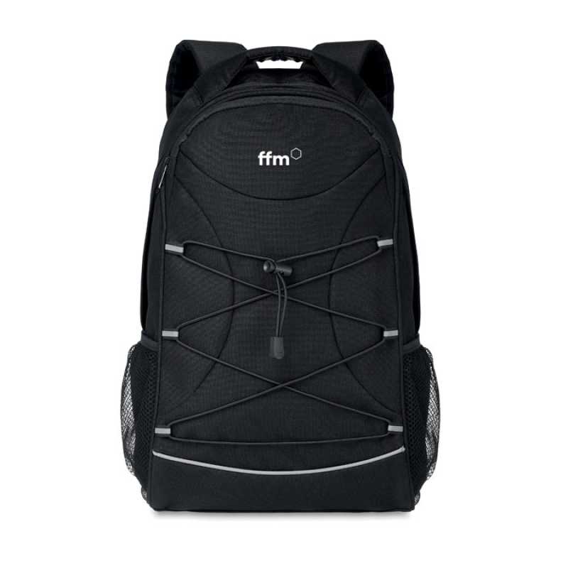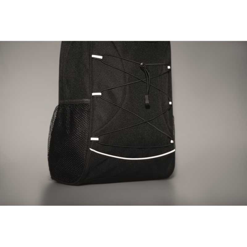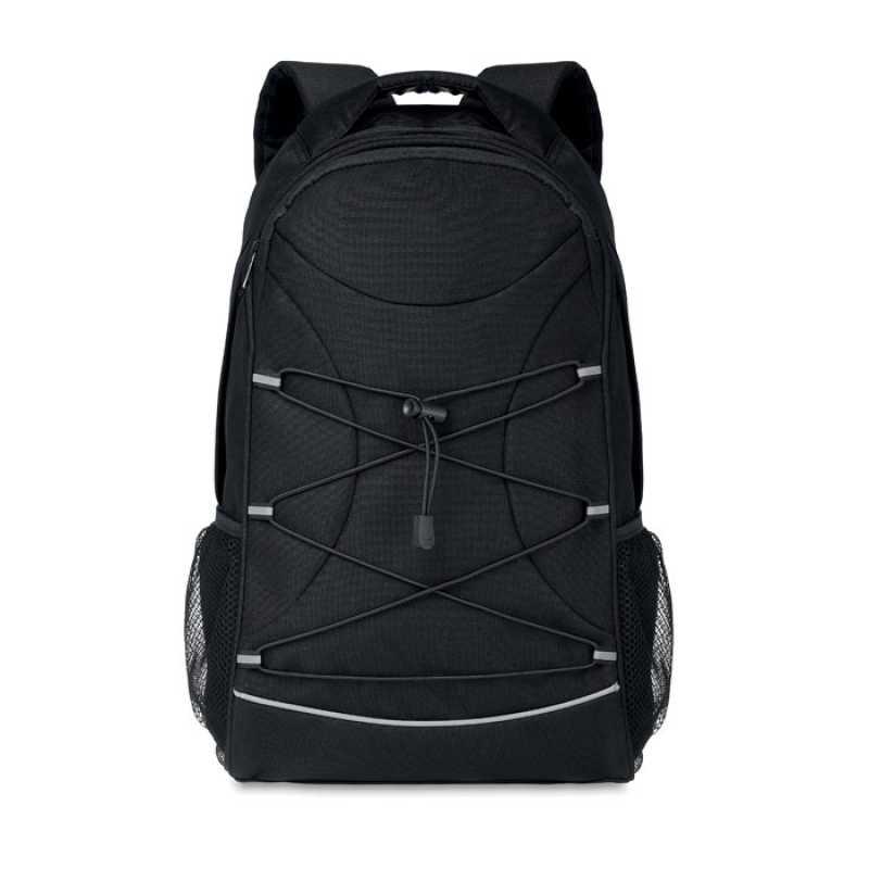 Batoh z 600D RPETu s tmavými popruhy vpředu a reflexním předním panelem. Síťované kapsy na obou stranách.