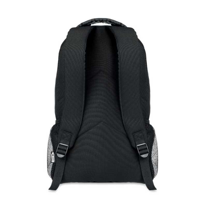 "Batoh z 600D RPET polyesteru a 210D podšívky. Má přihrádku na 15"" notebook, vnější kapsu na 10"" tablet na zip, 2 vnitřní kapsy, kapsy na pera, přední kapsu na zip a 2 boční kapsy. Polstrovaná záda a ramenní popruhy. Rukáv na kufr."