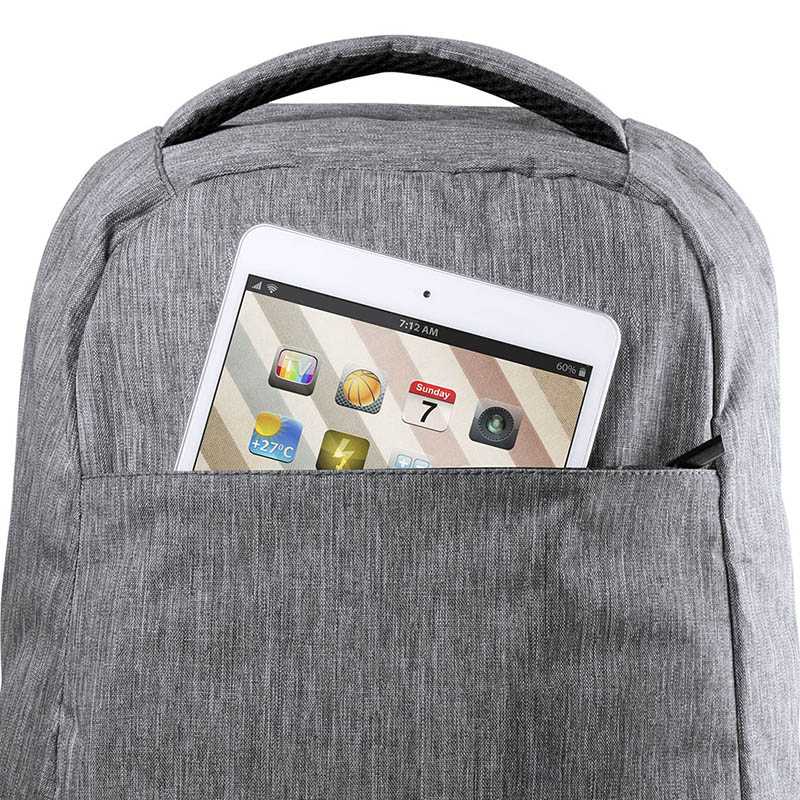 Ruksak s ochranou proti krádeži s viacerými priehradkami na zips, vystuženým priestorom na notebook (15") a tablet (12"), chrbtom a ramennými popruhmi. So vstavaným USB pripojením na power banky. 300D Polyester.