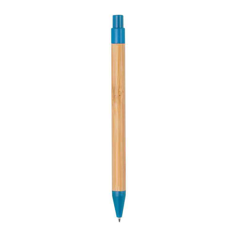 Ekologické plastové guľôčkové pero z pšeničnej slamy s bambusovým úchopom a farebnými časťami. S modrou náplňou.