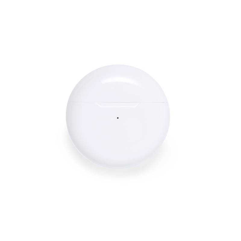 NOVINKA 2025. Bluetooth® earphones, made of RABS and in stylish white color, with the lid of the charging base lined in recycled leather.Bluetooth® 5.1 connection, hands-free function and 30 mAh battery. Ergonomically designed, with integrated touch control button on each earpiece and LED charging status light. Matching charging base with 300mAh battery. Including Type C charger cable and instruction manual in English and Spanish. Presented in an individual kraft design box.RABS or Recycled ABS material and recycled leather come from the recycling of items at the end of their lifespan. The recycled materials used include RCS certification, which guarantees their recycled origin.