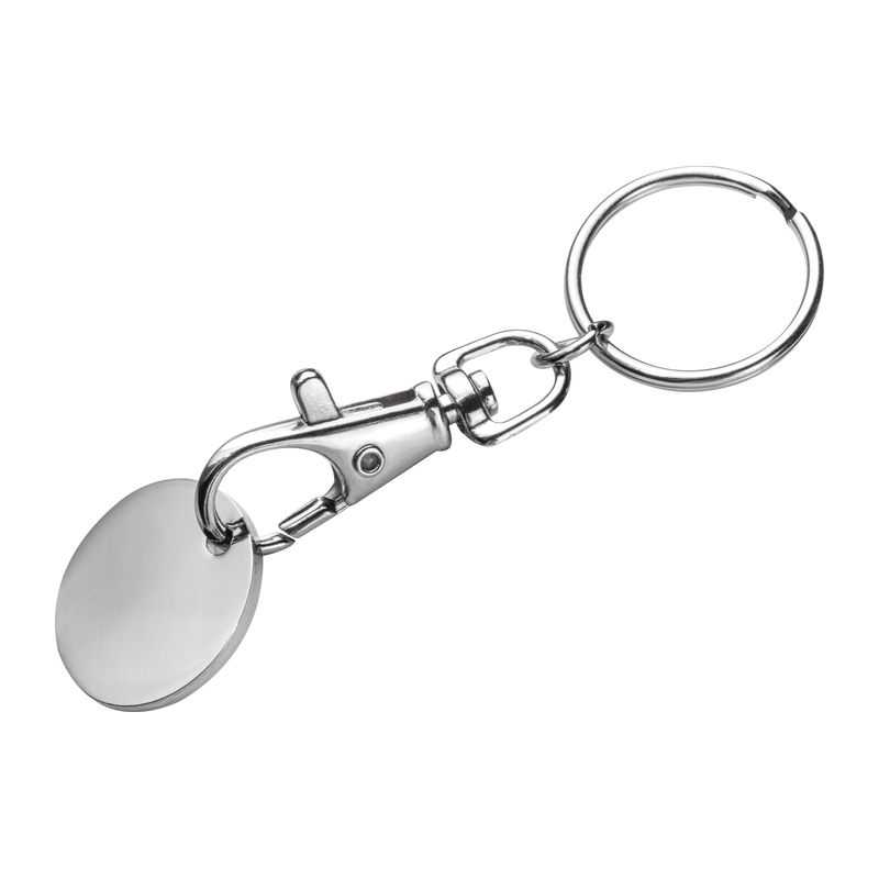 Kľúčenka s karabínkou a s odnímateľným žetónom do nákupných vozíkov z kovu.