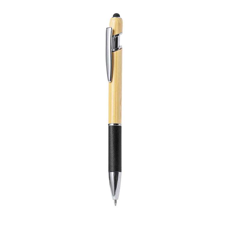 Hliníkové guľôčkové a dotykové pero s bambusovým úchopom a pogumovaným povrchom. So špeciálnou povrchovou úpravou pre zrkadlové gravírovanie zodpovedajúce farbe dotykového pera. S modrou náplňou.