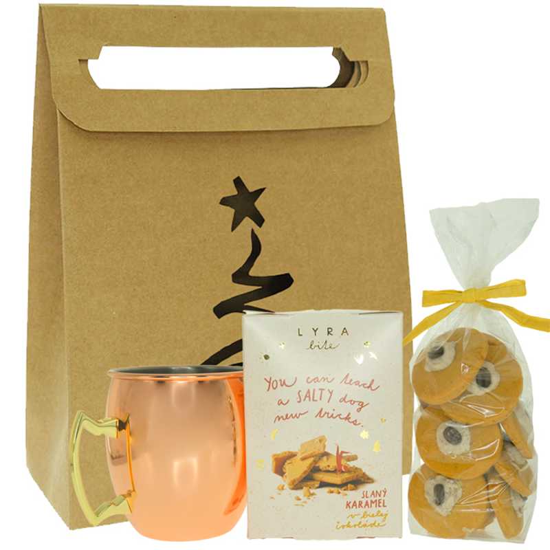 Hrnček s medeným povrchom 500 ml, Kúsky čokolády so slaným karamelom 100 g, Kávové kolieska 150g. Darčeková taška 30x23x10 cm (malá)