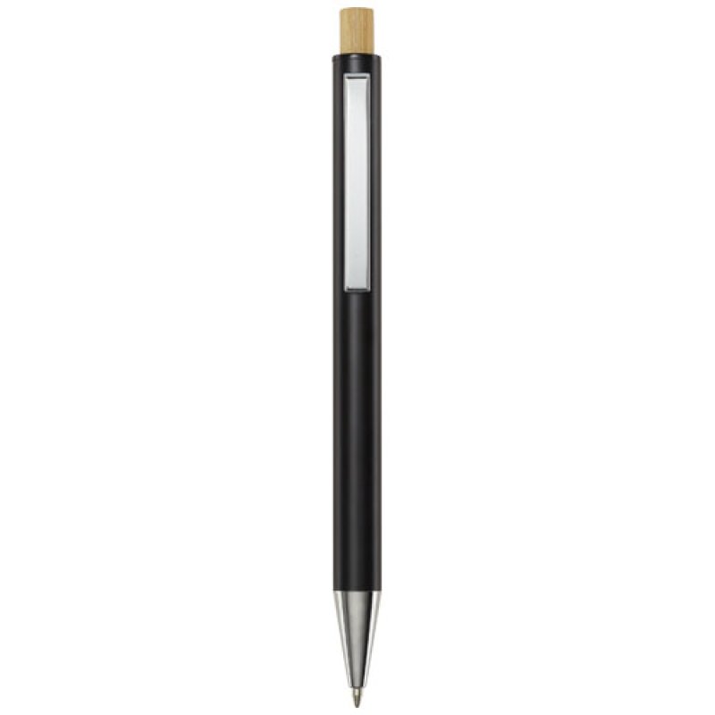 Kuličkové pero Cyrus je vyrobeno z recyklovaného hliníku, což vyžaduje méně energie než výroba hliníku z nerostných surovin. Snižuje také množství odpadu na skládkách a pomáhá šetřit přírodní zdroje s cílem snížit emise skleníkových plynů. Tlačítko je vyrobeno z bambusu. Barva inkoustu: Modrá. Délka psaní: 800 metrů. Rozměr hrotu: 1,00 mm.