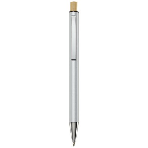 Kuličkové pero Cyrus je vyrobeno z recyklovaného hliníku, což vyžaduje méně energie než výroba hliníku z nerostných surovin. Snižuje také množství odpadu na skládkách a pomáhá šetřit přírodní zdroje s cílem snížit emise skleníkových plynů. Tlačítko je vyrobeno z bambusu. Barva inkoustu: Modrá. Délka psaní: 800 metrů. Rozměr hrotu: 1,00 mm.