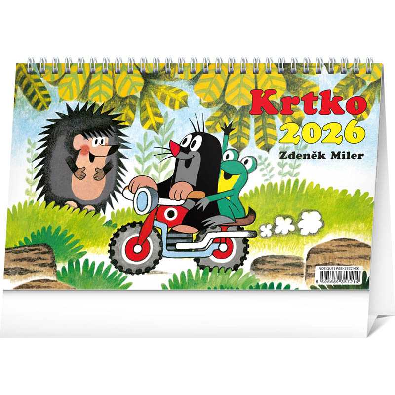 Krtkovho dobrodružstva si prial v detstve prežívať snáď každý z nás. Praktický stolný kalendár s ilustráciami Zdeňka Milera z obľúbených príbehov o Krtkovi obsahuje jeden obrázok na každý týždeň, kalendárium so slovenskými menami, sviatky a pamätné dni, fázy mesiaca a prehľad na rok 2026 a 2027.Priestor na potlač: 23,1 x 2,9 cm. Rozsah: 30 listov (obojstranná tlač). Rozmer: 23,1 x 14,5 x 1 cm. Hmotnosť: 0,2. Papier: 100 g/m2. Väzba: dvojitá špirála. Kalendárium: slovenské týždenné.