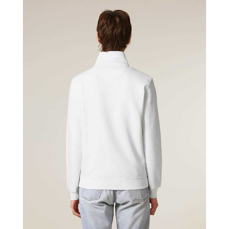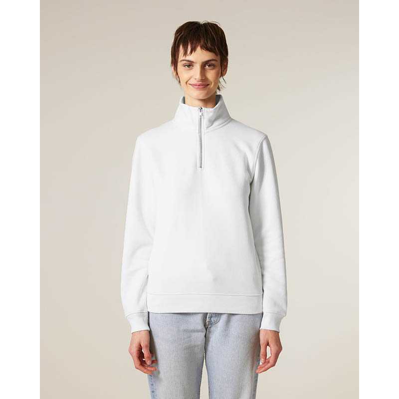 Sweatshirt with collar halfzip. 2x2 rib ending at sleeves and bottom hem. Material: 60% Poliester, 40% Cotton Colors: 400 red, 600 navy, 632 ocean blue, 728 fresh green, 900 black, 935 steel grey, 100 white, 120 grey melange Size: XS–5XL