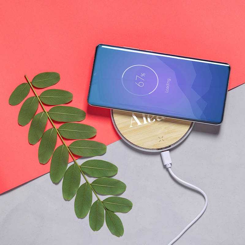 NOVINKA 2025. Nature line, wireless charging base in bamboo wood. Non-slip base, compatible with devices equipped with wireless charging technology and presented in an attractive design box. USB cable included.
