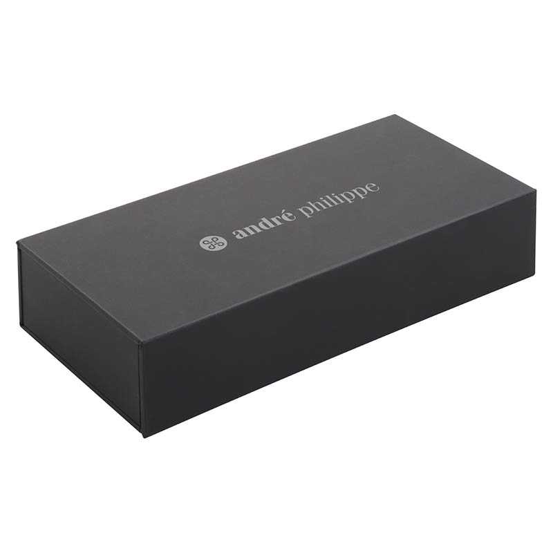 Elegantná sada kovového guľôčkového pera a roller pera s karbónovým telom. V čiernej darčekovej krabičke, s modrou náplňou. Značkový produkt André Philippe.