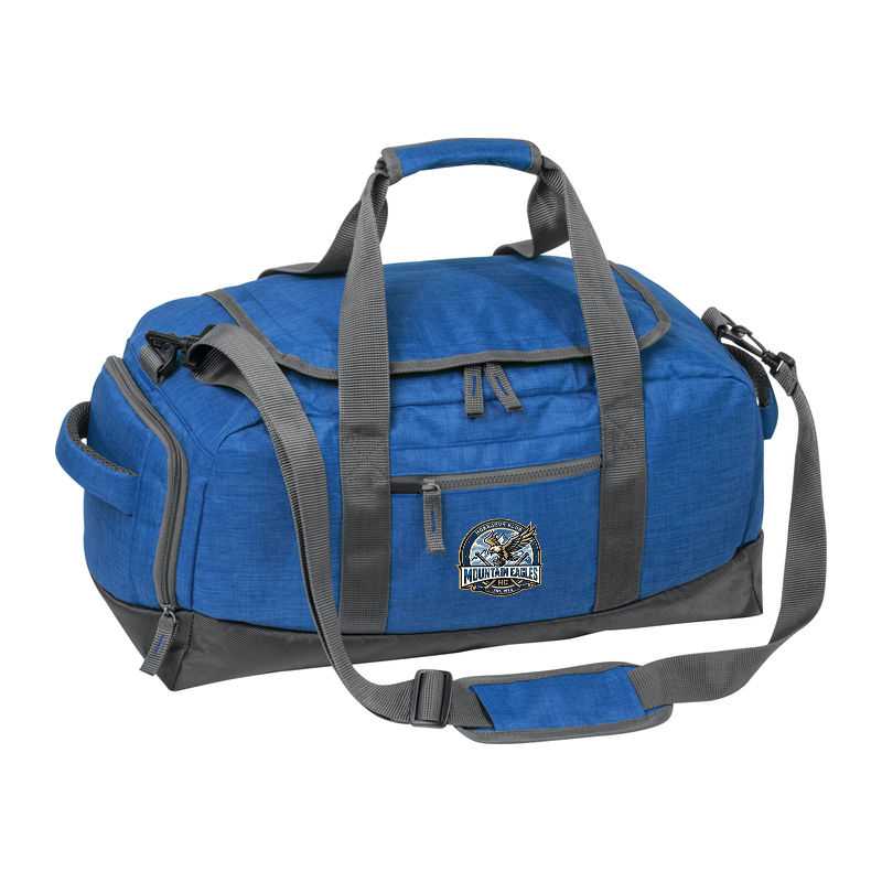 Polyester (600D) sports bag with front zipped pocket and adjustable shoulder strap.