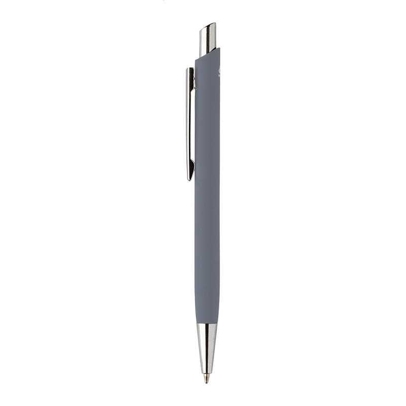 Otočné guľôčkové pero z kovu s gumovou povrchovou úpravou v klasickom štýle a modrou náplňou. Balené v čiernom puzdre.