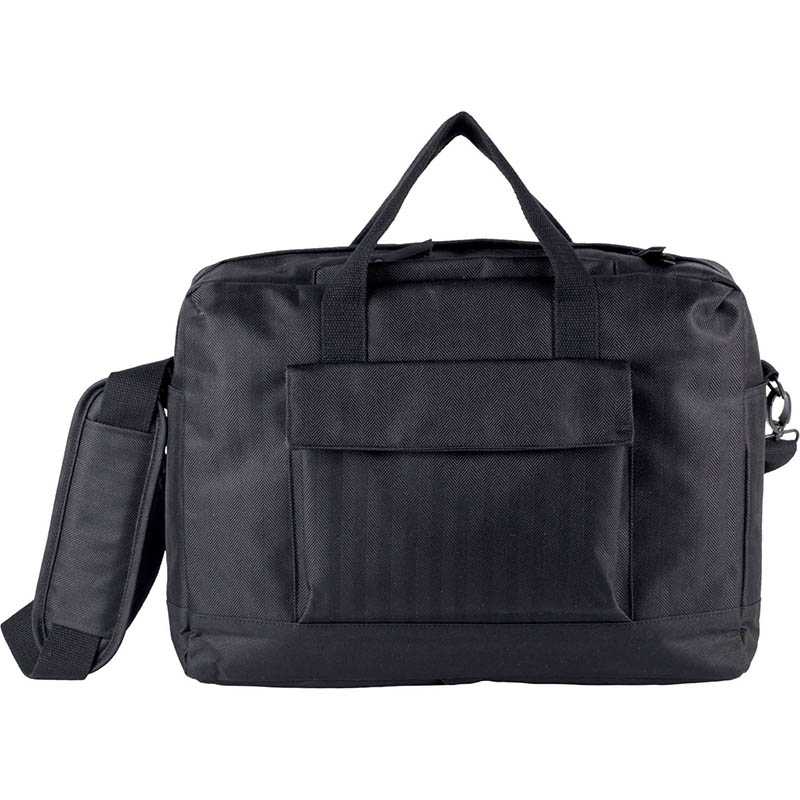 Taška na notebook zo 600D polyesteru.Základňa, rukoväti a predná chlopňa z polyuretánu.Polstrovaná priehradka, do ktorej sa zmestí 15-palcový notebook, a polstrované vrecko na zips na vloženie tabletu.2 vnútorné vrecká.1 vrecko na zips v hornej časti tašky na mobilný telefón.1 predné vrecko s chlopňou a cvokmi.Pútko na zadnej strane na pripevnenie tašky na vozík.Odnímateľný ramenný popruh.