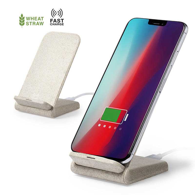 NOVINKA 2025. Nature line, wireless charger with smartphone holder functionality. Shell in wheat straw, to encourage the use of natural raw materials and reducing contaminant emissions. Fast charge, 10W function and compatible with devices equipped with wireless charging technology. LEd indicator for charging status and 100 cable. Wide printing area and presented in an attractive, individual, eco-design box.