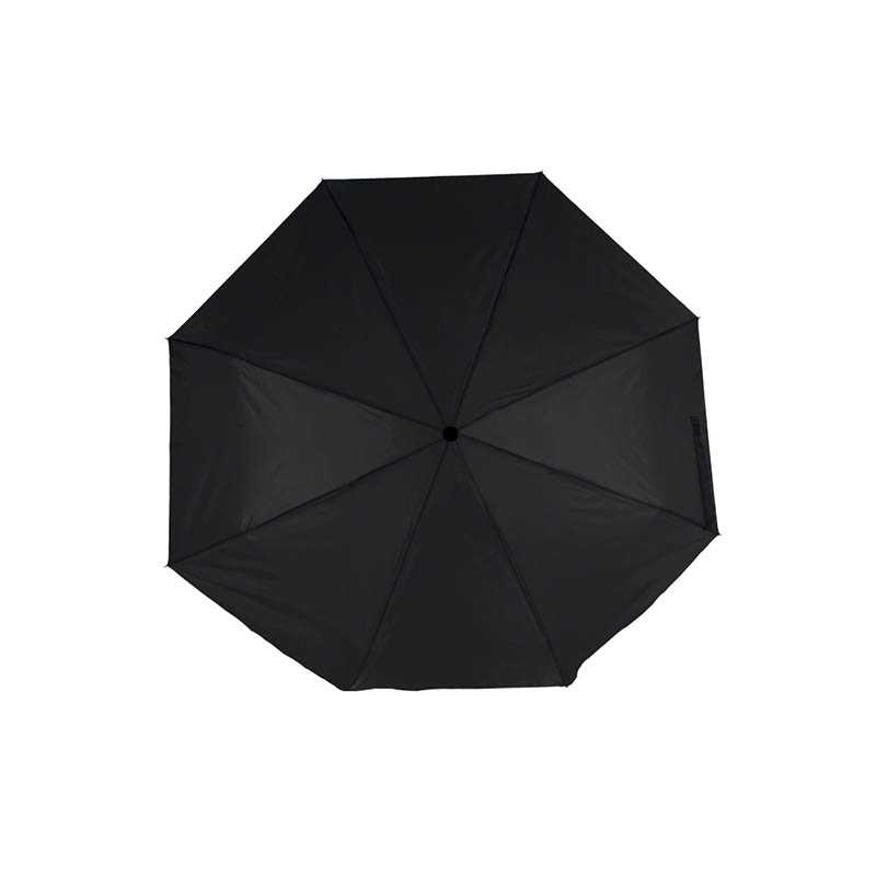 Polyester (190T) foldable umbrella with eight panels. Metal frame and wooden handle. Including nylon sleeve.