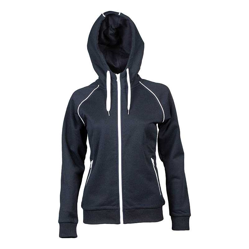 "Lady’s cotton – polyester sweater - Special dry fabric - Lined hood - Full zip with waterproof cover - Raglan sleeves - Two zip-pocket - Contrasting details - Colored tape inside collar - Ribbed cuffs and band at the waist"