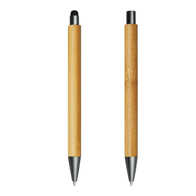 Bamboo and metal writing set consisting of a ballpoint pen with rubber tip for capacitive screens and a mechanical pencil. Packaged in a cardboard case. Blue ink.