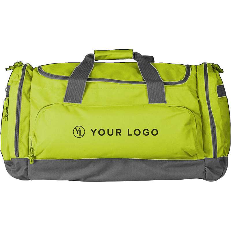 Polyester (600D) sports bag with various compartments and an adjustable shoulder strap.