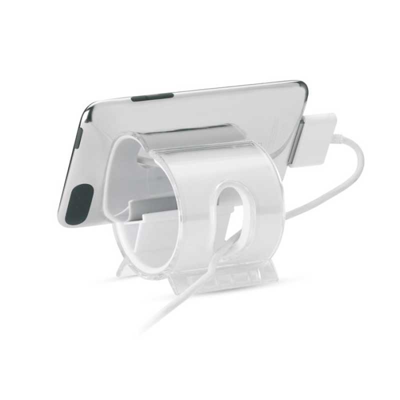 NOVINKA 2025. Smartphone and tablet holder made of resistant ABS. Compact and foldable design to take it anywhere. With different angle positions and support pads. Presented in an individual recycled bag.