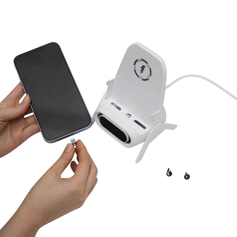 Plastový stojan na mobilný telefón so vstavanou rýchlou bezdrôtovou nabíjačkou (10W). Vrátane USB nabíjacieho káblu.