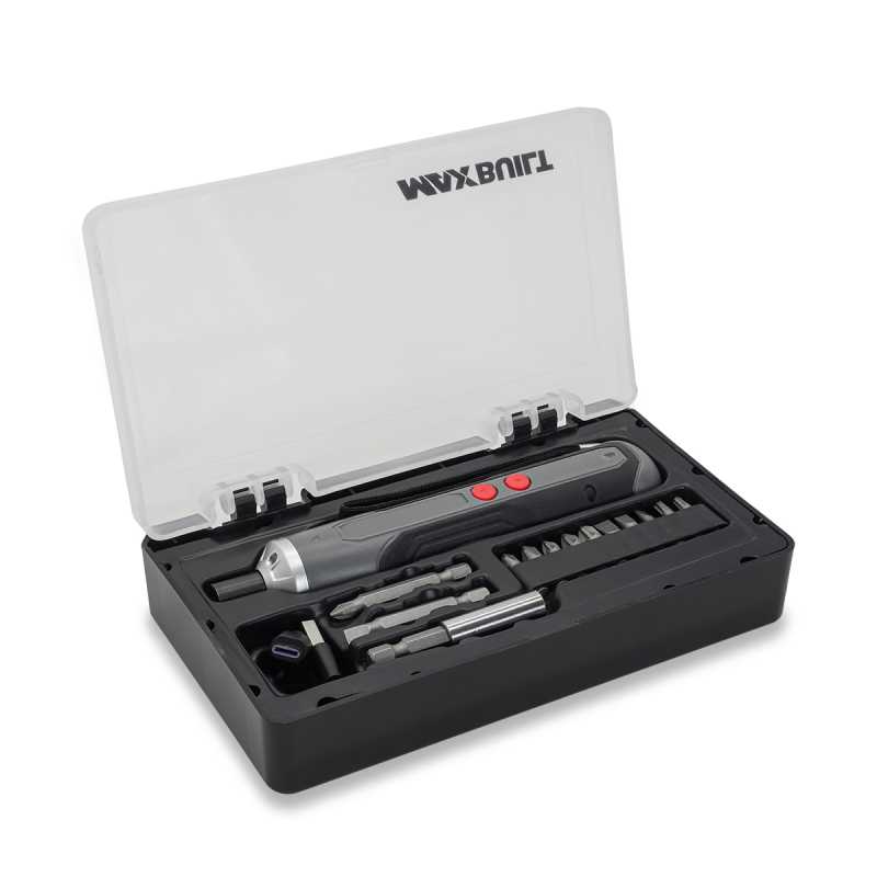 Set s akumulátorovým skrutkovačom v pevnom kufríku z plastu. Obsah: skrutkovač s ergonomickou rukoväťou a 2 smerovými tlačidlami pre jednoduché skrutkovanie a odskrutkovanie, 10 bitov rôznych veľkostí, 4 nástavce na bity, magnetický nástavec a USB kábel n