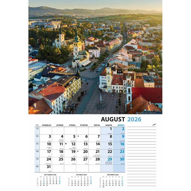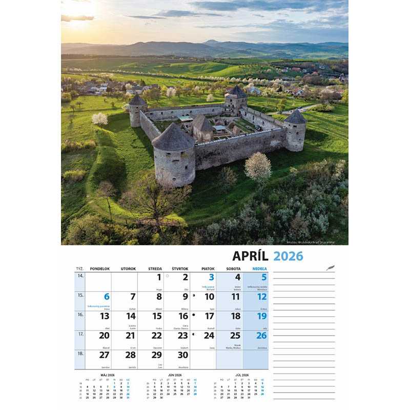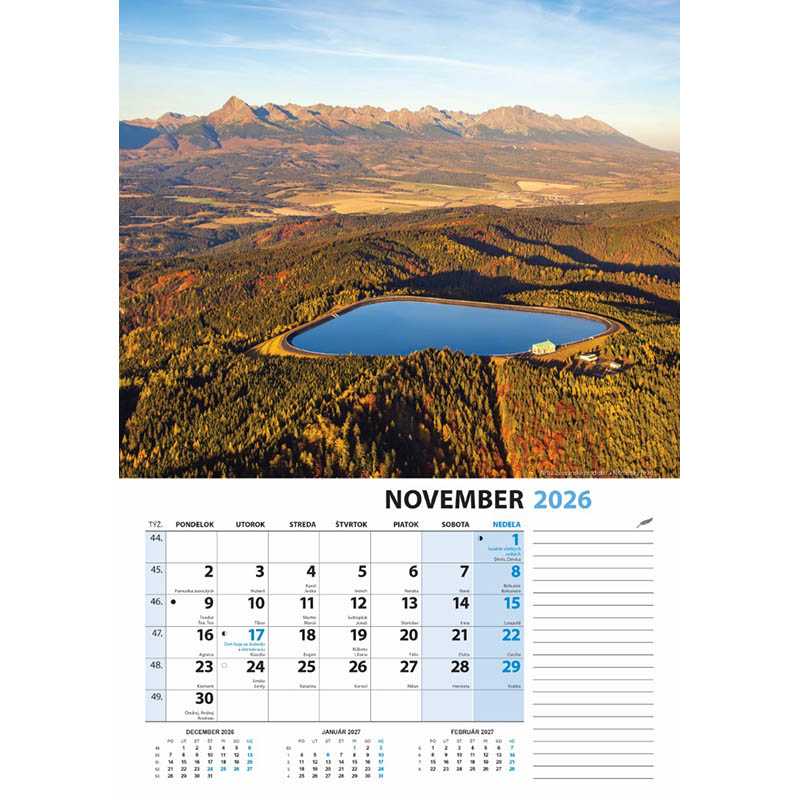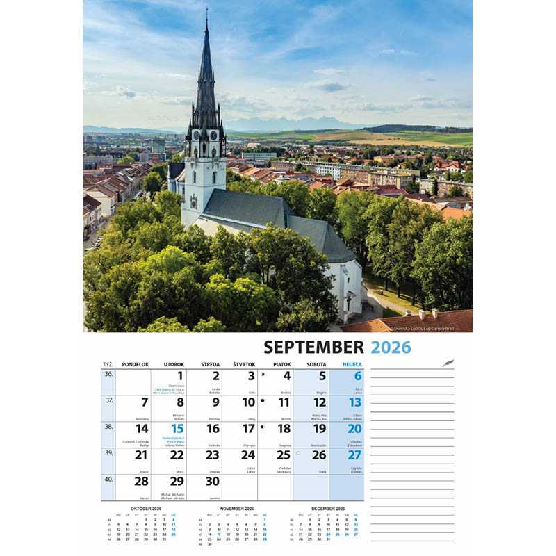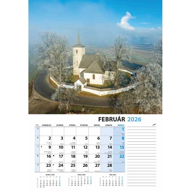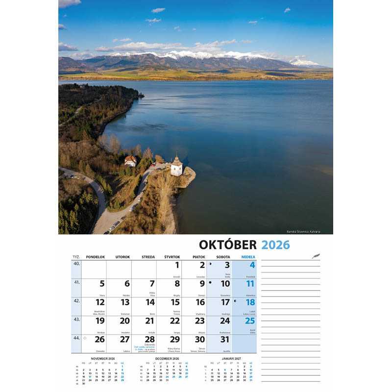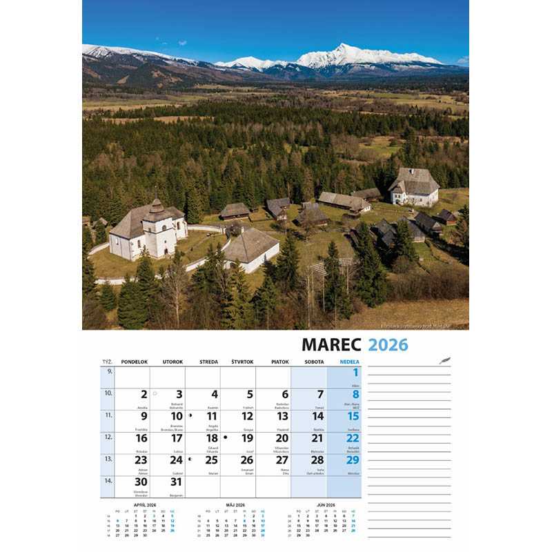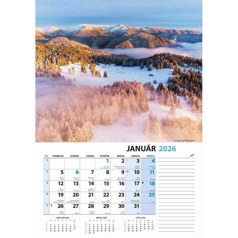Kalendár Slovenská krajina 2026. Formát kalendára: 31,5 x 45 cm . Kalendárium: slovenské trojmesačné menné . Rozsah kalendára: 14 listov . Twinová väzba . Priestor na potlač: 31,5 x 7 cm