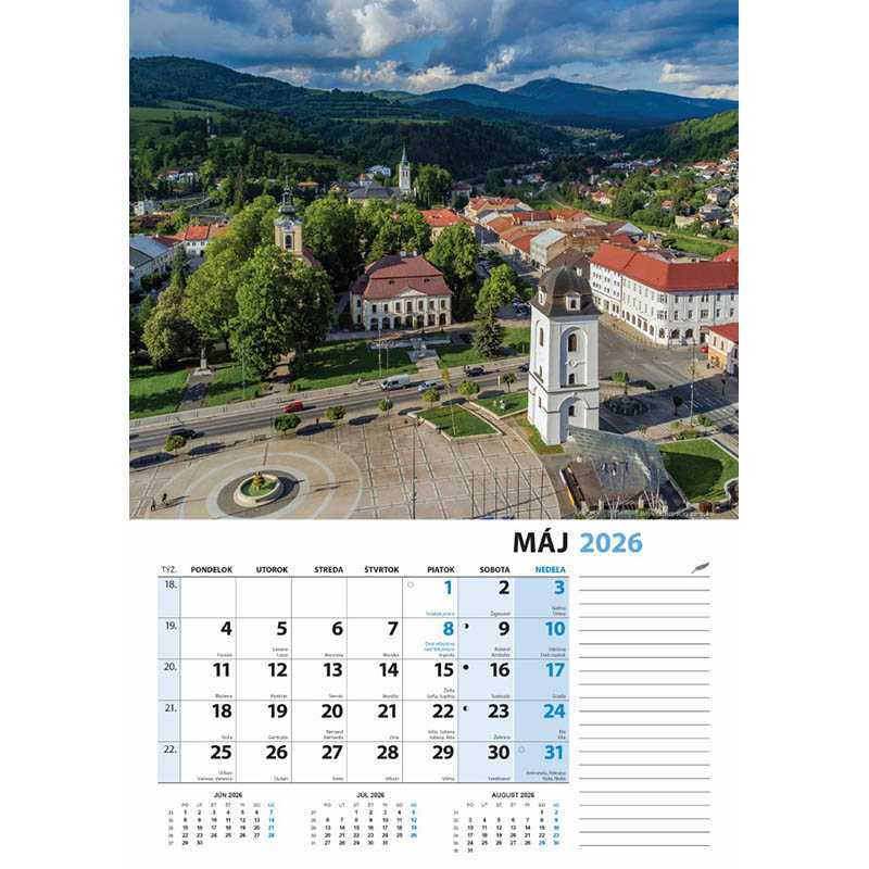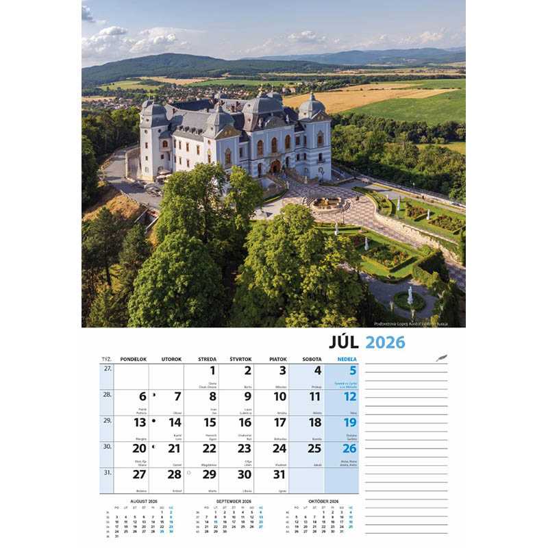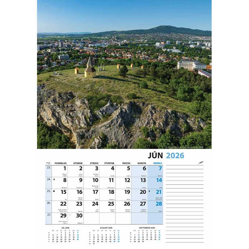 Nástenný kalendár Slovensko 2026. Formát kalendára: 31,5 x 45 cm. Kalendárium: slovenské mesačné mennné. Rozsah kalendára: 14 listov. Twinová väzba. Priestor na potlač: 31,5 x 7 cm