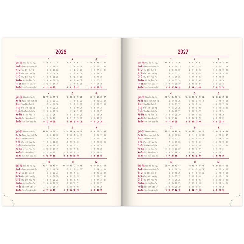 Nový, cenovo dostupný rad diárov s obálkou z ekologického papiera spája štýl a udržateľnosť. Týždenné rozloženie s česko-slovenským kalendáriom a doplnkovou angličtinou, nemčinou, maďarčinou a ruštinou.• kalendárium od decembra 2025• mesačný plánovací kalendár 2026 • mesačný plánovací kalendár 2027• ročný plánovací kalendár 2026–2027 • pracovný plánovací kalendár • sviatky Českej a Slovenskej republiky a zahraničné sviatky