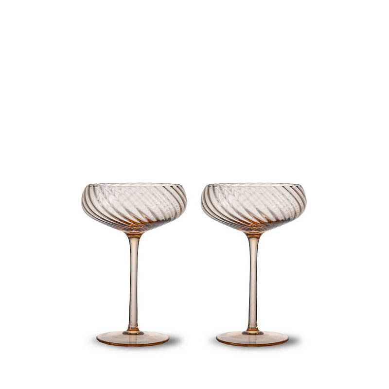 Opacity Champagne coupe is designed for the perfect experience - on the table, in the hand, and while drinking. It's a thin and delicate champagne coupe with a beautiful twisted glass pattern in clear glass. It also works wonderfully for desserts or morning juice, adding a festive touch. The design achieves a perfect contrast between luxury and boldness. Designed by Byon Studio. Delivered in a 2-pack in a Byon box. Material: glass Weight: 132 g Width: 110 mm; Height: 160 mm; Length: 110 mm; 30 cl Color: peach