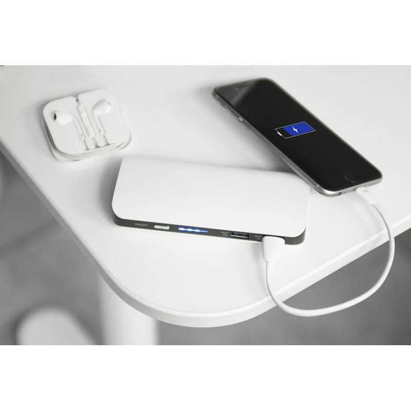 Powerbanka z ABS s kapacitou 20 000 mAh a výkonom 22,5 W na rýchle nabíjanie a bezdrôtové indukčné nabíjanie 15 W. Súčasťou je kábel USB-C a displej s indikátorom úrovne nabitia. Batéria Li-ion, 3,7 V, 74 Wh. Vstup USB-C1: 5 V/2 A, 9 V/2 A, 12 V/1,5 A; C2