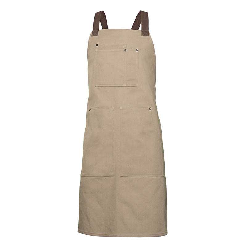 Adjusting straps made of cotton webbing tape in contrast colour Crossed back Denim-style rivets Four pockets: 1 double chest pocket with a pen compartment 2 side pockets