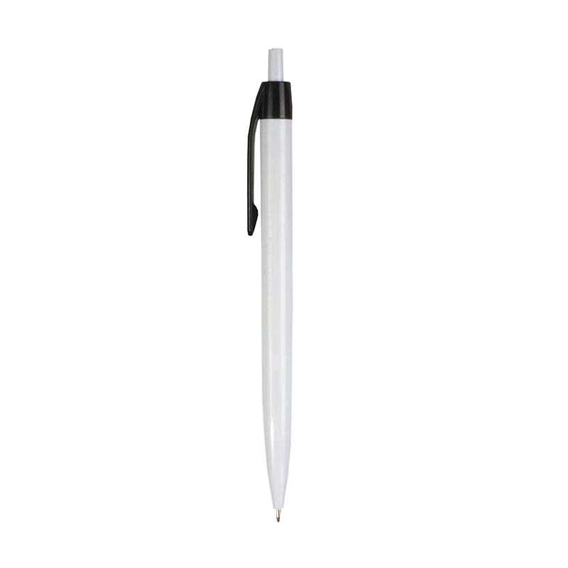 Biele plastové guľôčkové pero s modrou tuhou a klipom v rôznych farbách.