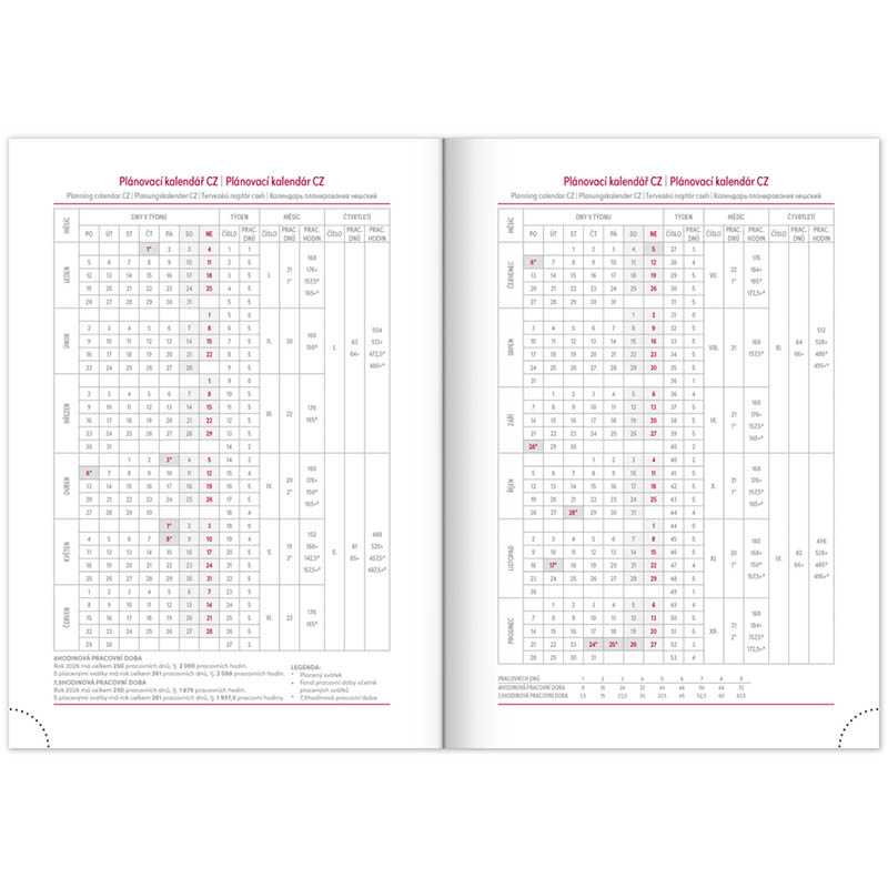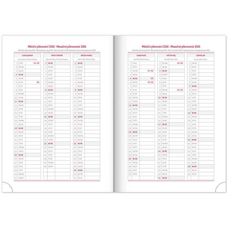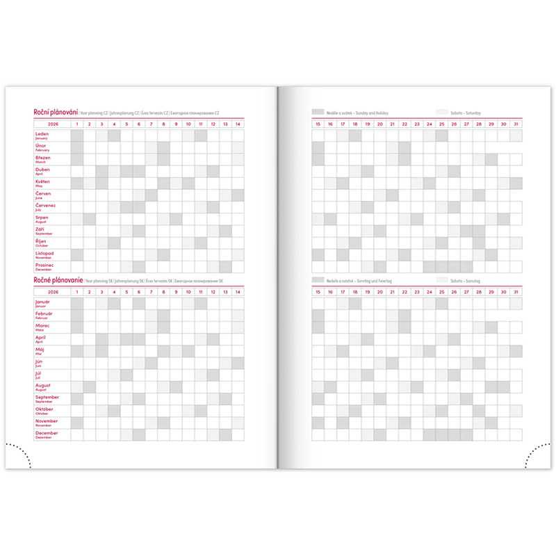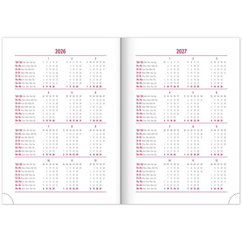 Nový rad diárov v modernom dizajne doplnenom o pevnú gumičku a pútko na pero. Týždenné rozloženie s česko-slovenským kalendáriom a doplnkovou angličtinou, nemčinou, maďarčinou a ruštinou.• kalendárium od decembra 2025• ročný plánovací kalendár 2026–2027 • pracovný plánovací kalendár • sviatky Českej a Slovenskej republiky a medzinárodné sviatky • rozšírený zoznam českých mien • miesto pre osobné údaje • perforované rožky• priestor pre poznámkyRozsah: 128 strán. Rozmer: 9 x 15,5 x 1 cm. Hmotnosť: 0,08. Papier: 70 g/m2 krémový papier. Väzba: tuhá knižná s gumičkou a pútkom na ceruzku. Kalendárium: 6 jazyčné (CZ, SK, GB, DE, HU, RU) .