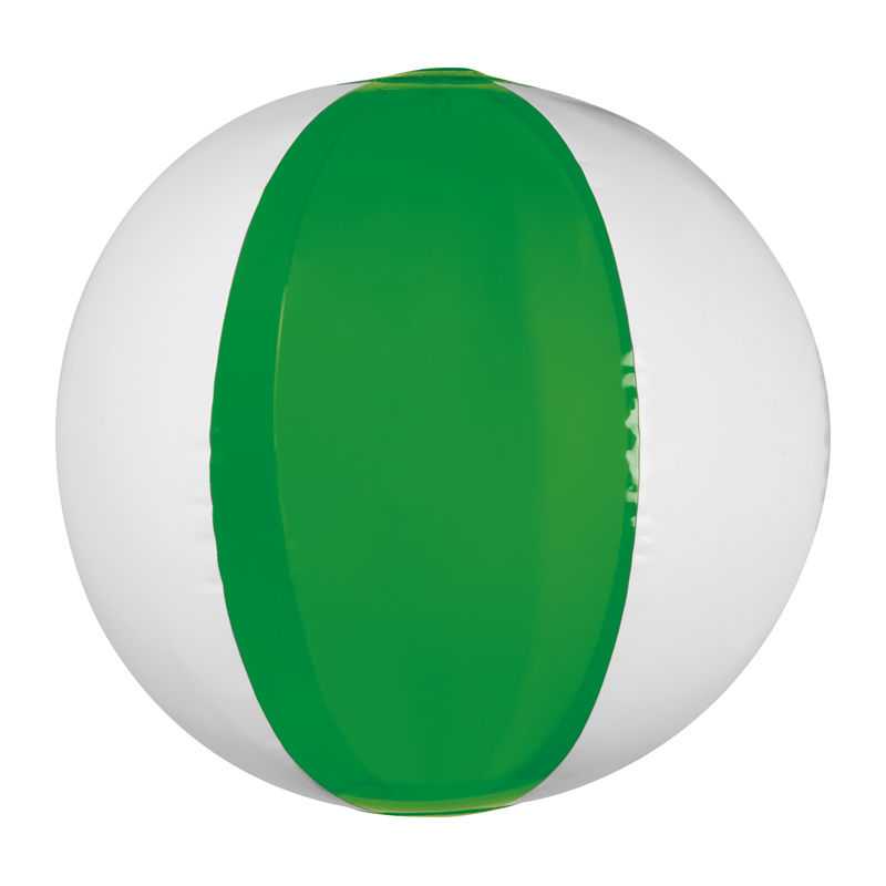 Plážová lopta so 6 panelmi, plná biela farba a transparentné farebné panely, PVC. Dĺžka nenafúknutej lopty: 370 mm.