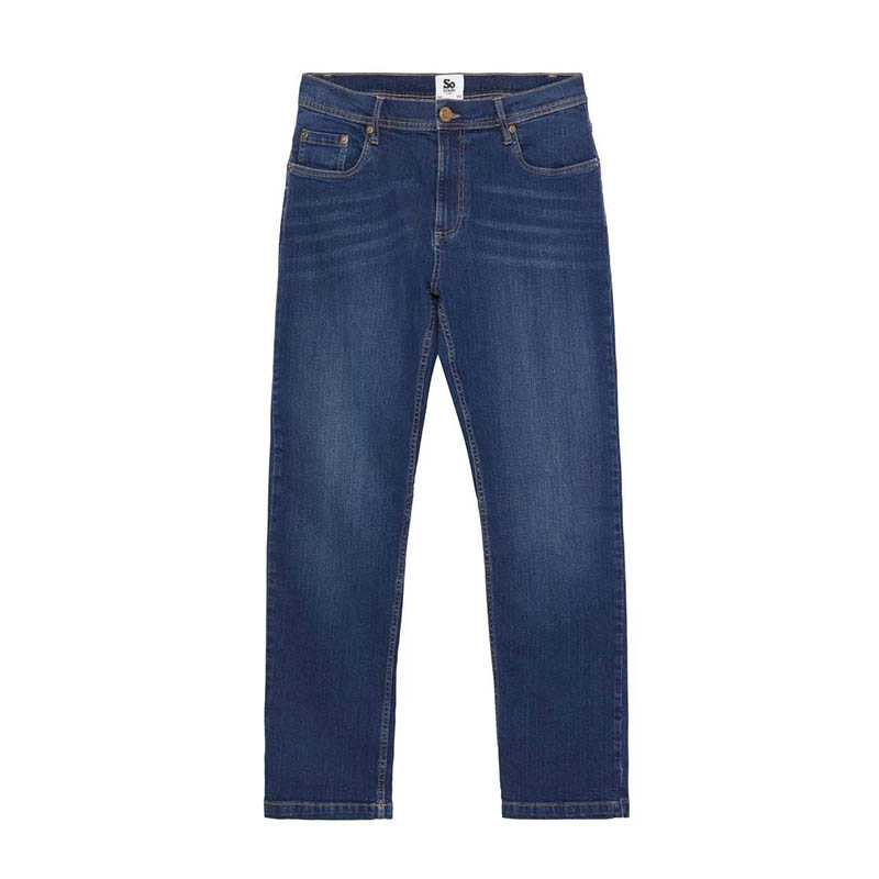 99 % bavlna/1 % elastan.Rovný strih.Strečový denim.Štýl s 5 vreckami.Zapínanie na narážací gombík a zips YKK.Kovové nity v rohoch vreciek.Detail prešívania dvojitým prešívaním.Látkové pútka na opasok.