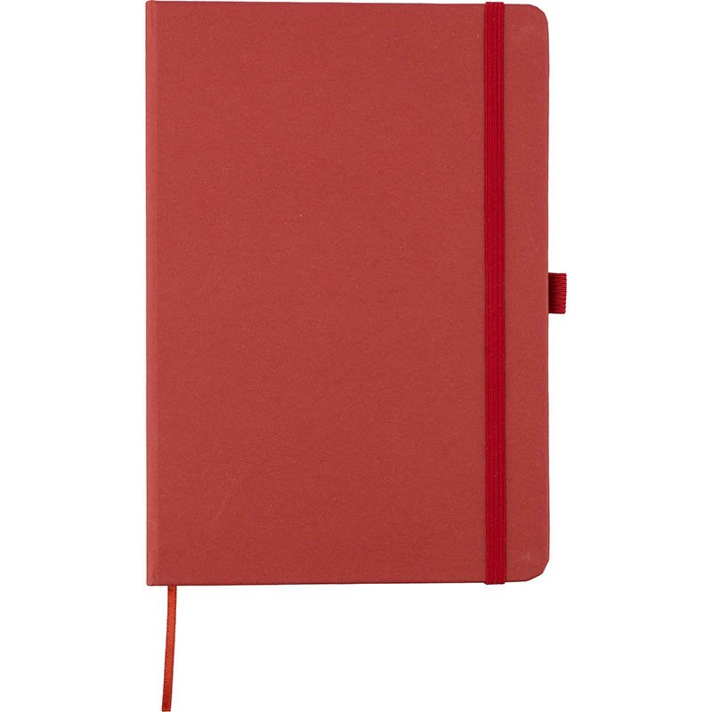 Recycled carton notebook (A5) with 160 lined pages. With elastic to keep closed and a ribbon bookmark.