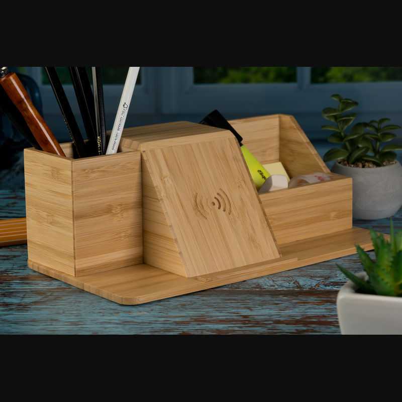 Bambusový stolový organizér s 10 W indukčnou nabíjacou stanicou, úložným priestorom a držiakom na pero.