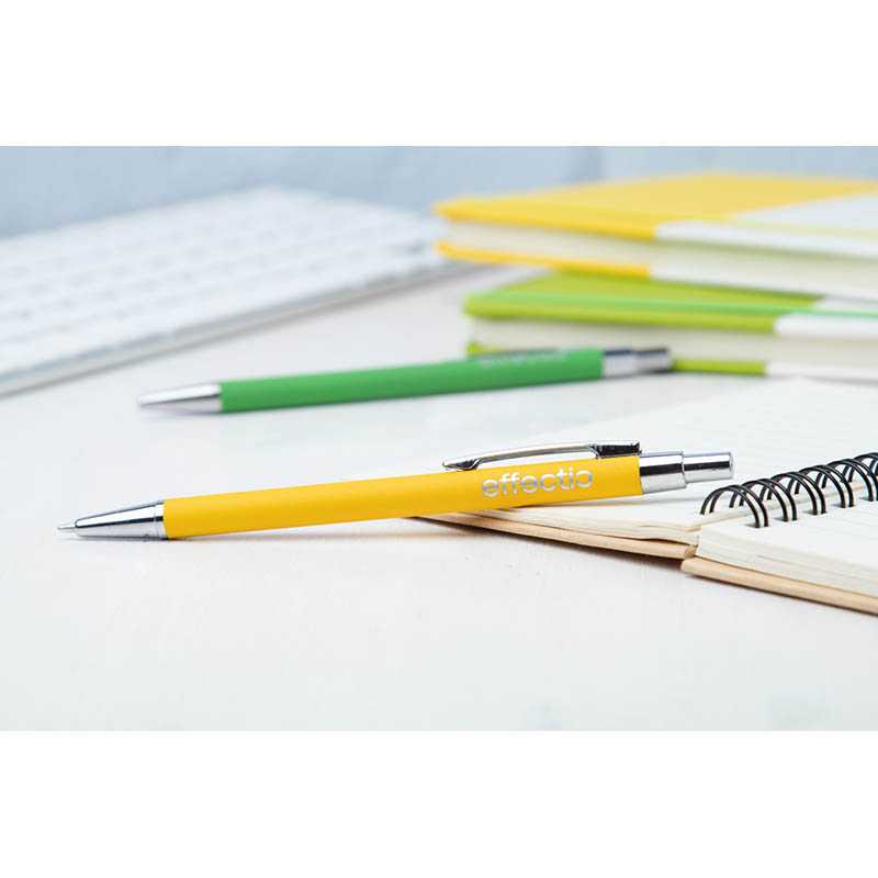 Hliníkové guľôčkové pero s pogumovanou úpravou a modrou náplňou. Špeciálny povrch na zrkadlové gravírovanie.
