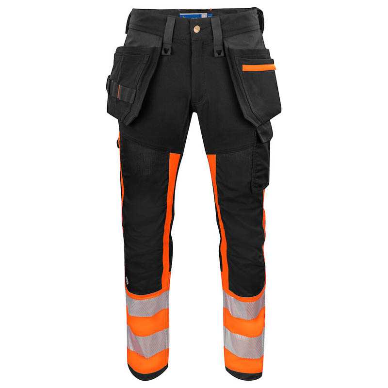 Lined trousers. Longer at back to counteract gaps. Adjustable waist. Side pockets. Leg pocket with phone compartment and flap on right side. Folding rule pocket on left leg. Back pockets with flap. Leg zipper. Internal kneepad pockets. Material: 100% Polyester. Reinforcements in 100% polyamide, 100% polyester lining Colour: yellow-10, orange-17, yellow black 11 Size: C44–C62, D84–D120, C146–C156